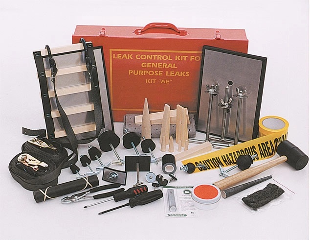 Universal kits are designed to plug hazardous material leaks in any type of low-pressure vessel. The kits contain everything needed to respond to leaks in tanks and drums. The wide variety of sealing devices and materials address surface holes of all shapes, as well as cracks and gashes. All bolts, back-up plates, and hardware manufactured from 304 stainless steel. Accompanying tools are available in standard or non-sparking versions.